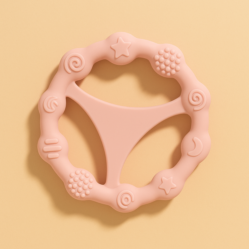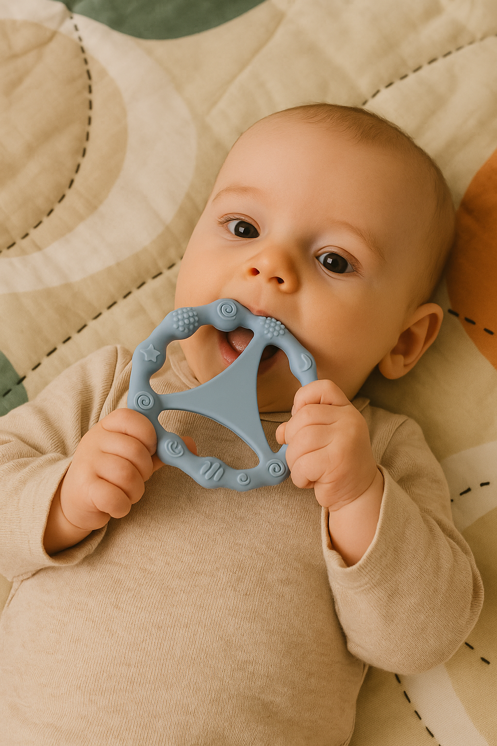 Ses huit zones texturées (étoiles, lunes, spirales, picots et rainures) offrent des sensations variées qui massent délicatement les gencives et éveillent le sens du toucher.
